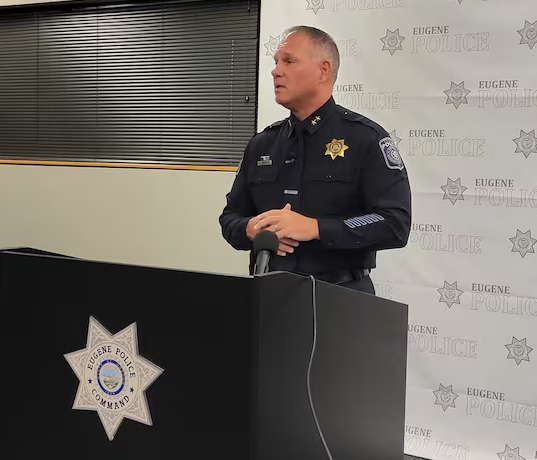Eugene Police Chief Chris Skinner addresses reporters on Friday, Oct. 10, 2025.