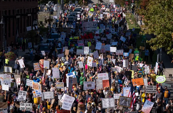 Tens of thousands of Oregonians turned out on Saturday to protest President Donald Trump, filling city streets and parks while marching in inflatable costumes and toting signs.
