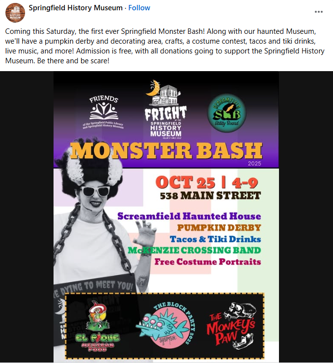 “Fright at the Museum has quickly become one of Springfield’s favorite traditions,” said Maddi McGraw, Museum Curator. “It’s a fun way to celebrate the season, connect with history, and support the museum’s mission.”