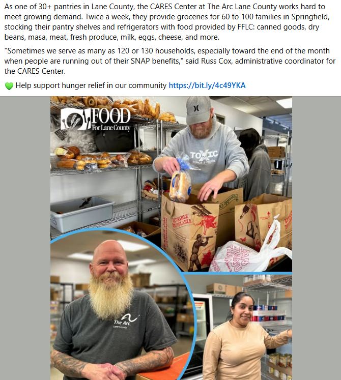“Food for Lane County is already seeing high numbers of pantry visitors at a time when our food supply has been limited due to federal program cuts. We want all Lane County residents to have the food and resources they need to thrive, and we’re very concerned about the welfare of our community if SNAP benefits aren’t available.” said Food for Lane County Director of Development and Communications, Rebecca Sprinson.