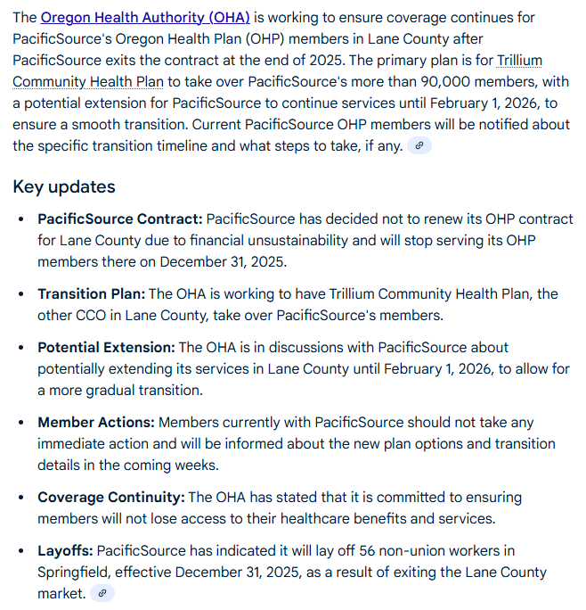 Based on OHA’s review of information provided by Trillium, with the interest to ensure clarity for providers and members and time for Trillium to take meaningful actions to expand their network, OHA is moving forward to allow the CCO to broaden coverage to all OHP members in Lane County for 2026. To allow more than 90 days for the transition of members between CCOs, OHA is working with PacificSource on the potential to continue to serve as a CCO in the region until Feb. 1, 2026.