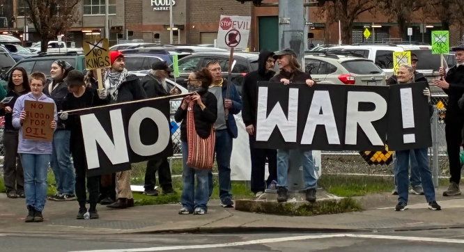 Hundreds of people gathered at Eugene’s downtown federal building expressing opposition to United States strikes in Venezuela, authorized by President Donald Trump, at an anti-war rally Saturday, January 3.