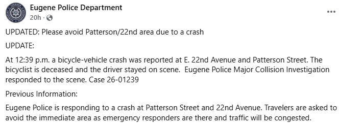 The name of the deceased is being withheld pending notification of next of kin. This is an active investigation and the Cottage Grove Police Department is being assisted by the Lane County Sheriff’s Office and the Lane County District Attorney’s Office. If anyone has any information about this investigation, they are asked to call the Cottage Grove Police Department at 541-942-9145 ext. 1.