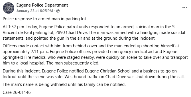 On January 20, 2026 at about 5:30 AM officers with the Cottage Grove Police Department responded to a report of a male who was found on the ground, unconscious and bleeding in the 1500 Block of HWY 99 in Cottage Grove.