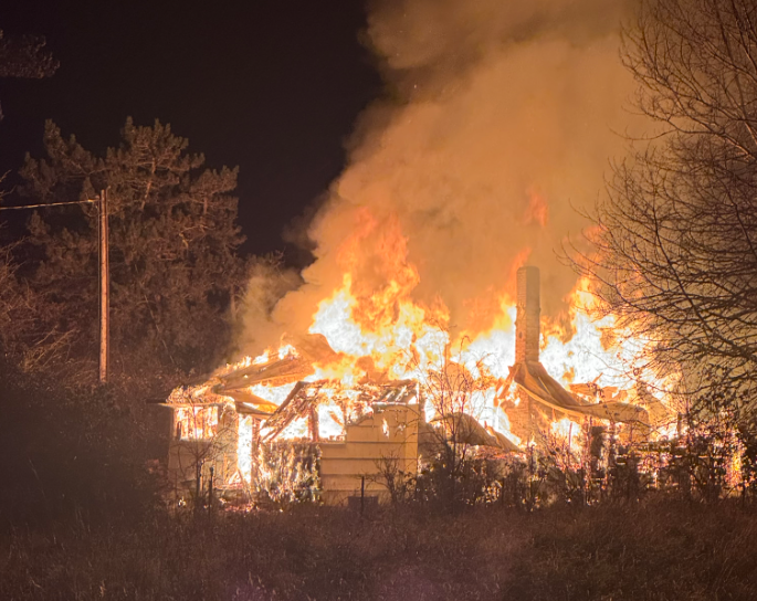 Eugene Springfield Fire responded to the intersection of Fisher Rd & Royal Ave for a house fire. Just before 3 AM on Monday February 1st, a passer by reported the fire stating the flames were taller than the house.