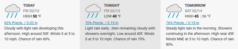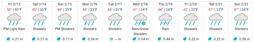 By Sunday, we’ll see the rain continue, with highs in the upper 40s, followed by colder weather Monday for President’s Day, when rain and snow are likely to arrive. Expect temperatures near 40°F, with rain mixing with snow at higher elevations.