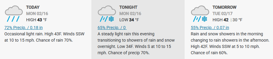 Today stays mostly cloudy with a high near 50 and spotty light rain between midmorning and midafternoon. Conditions deteriorate after midnight as steadier rain develops. By Tuesday morning, rain may briefly mix with snow again before changing back to rain as temperatures rise to the mid-40s.
