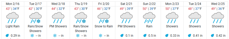 According to the National Weather Service in Portland, rain spreads in by late tonight, with precipitation chances climbing to 90 percent Monday. Highs reach only 45 degrees Monday, and rain may mix with snow at times as snow levels fall from around 2,500 feet to near 1,800 feet. By Monday night, snow levels drop closer to 1,200 feet, with lows near 33 degrees.
