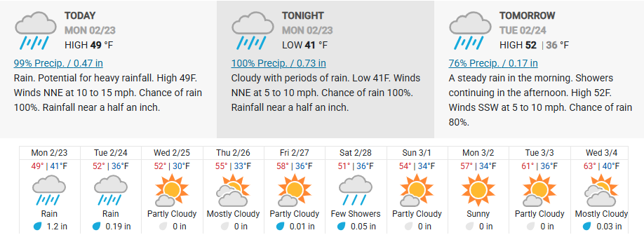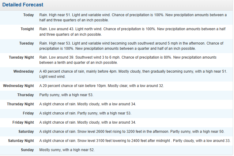 Temperatures hover near 50 degrees with steady light rain and low visibility in spots. According to the National Weather Service in Portland, rain continues through today with a 100 percent chance of precipitation. Additional rainfall between a tenth and a quarter inch is expected by evening, with heavier totals arriving tonight.