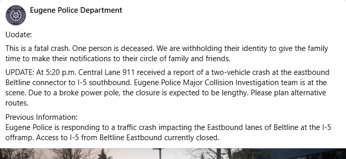The collision, which also involved a power pole, resulted in lengthy delays. The ramp did not completely reopen until 1:40 a.m., according to a spokesperson for the Oregon Department of Transportation. This also caused power outages all the way to Beltline and Barger.