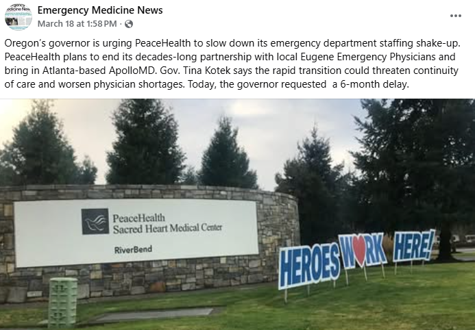 We’re all here with a simple message for PeaceHealth executives: Renew the contract with Eugene Emergency Physicians and stop trying to outsource our healthcare.” – Chris Rompala, RN, ONA bargaining unit chair and board member — Sign the petition to show you support!https://ow.ly/C4W550Yu1rL